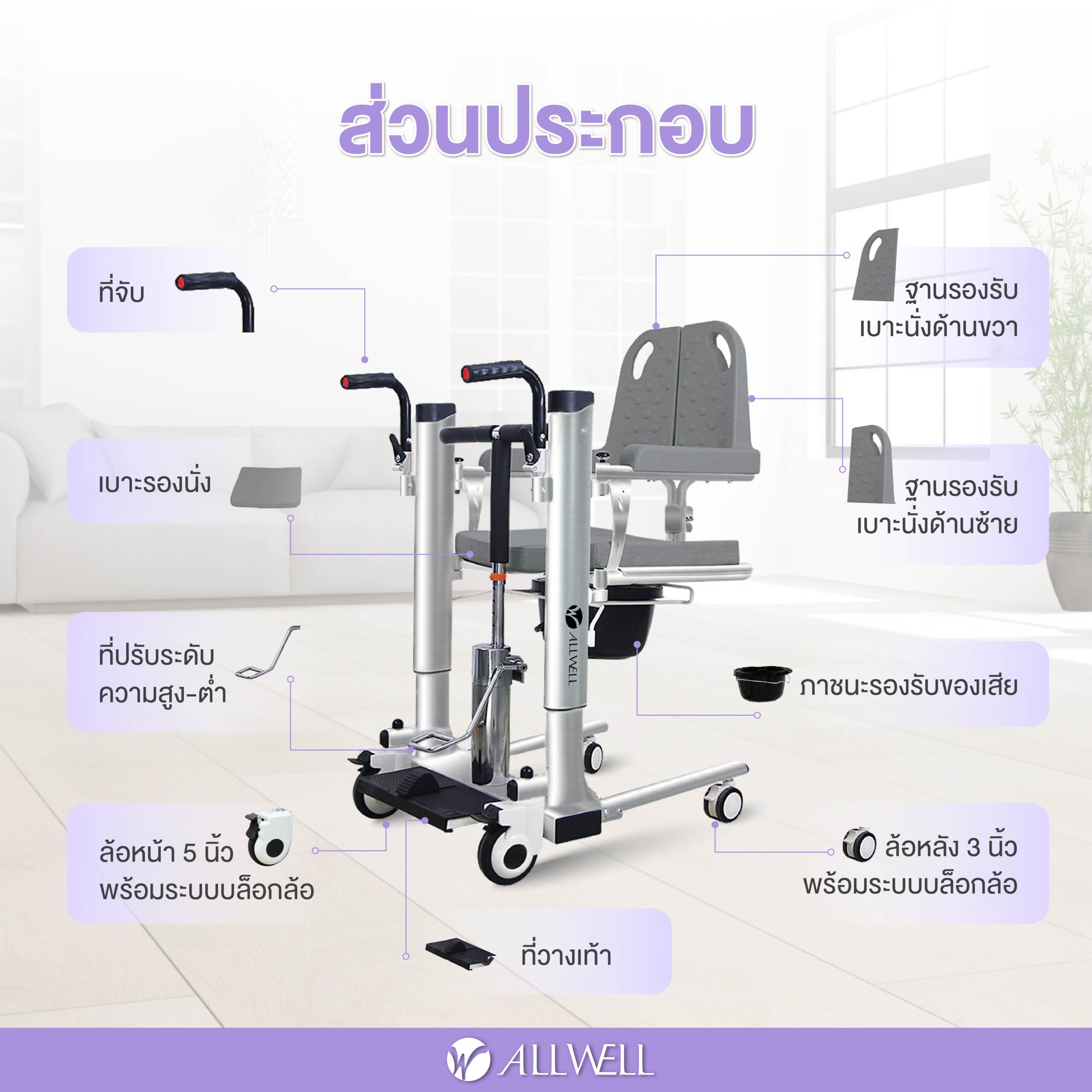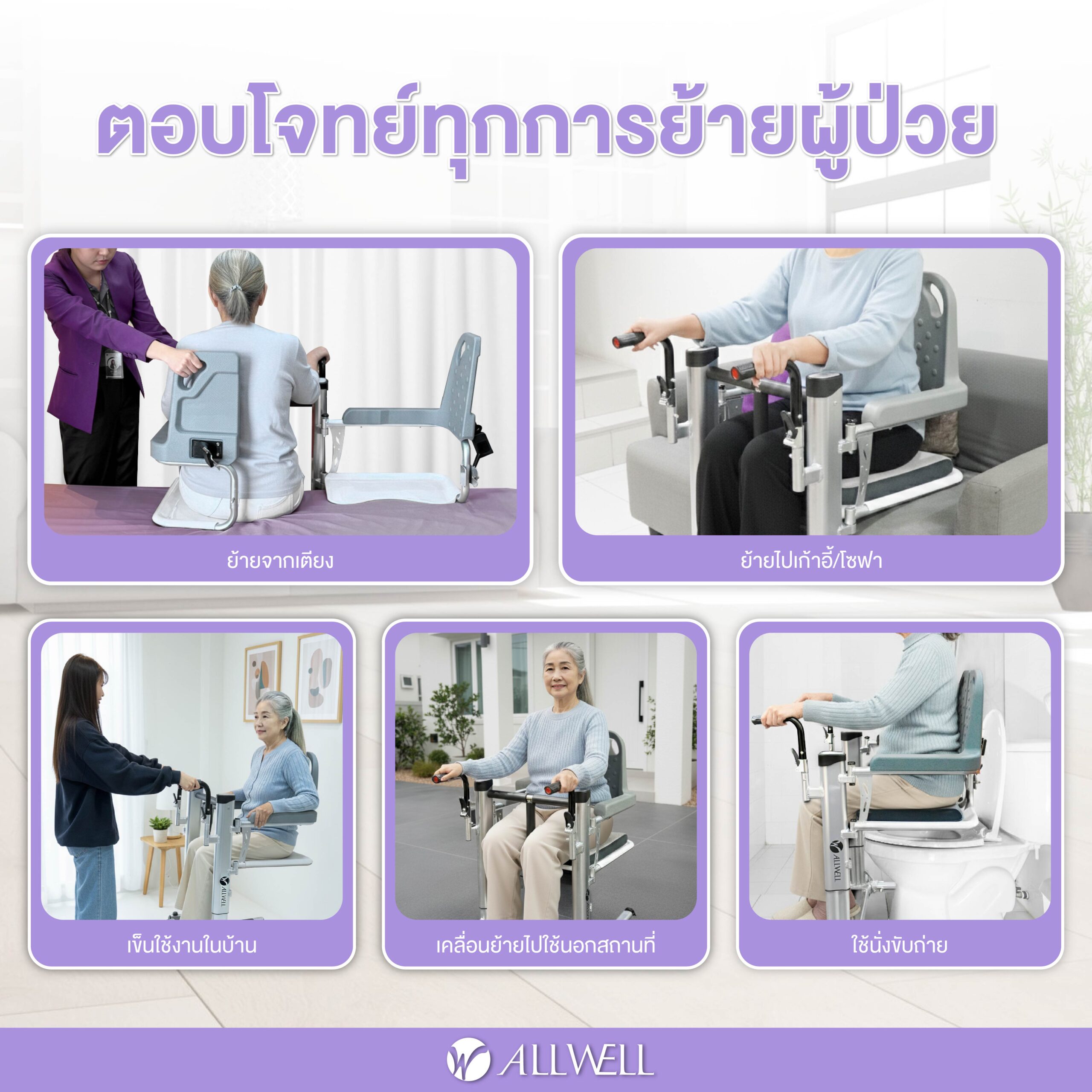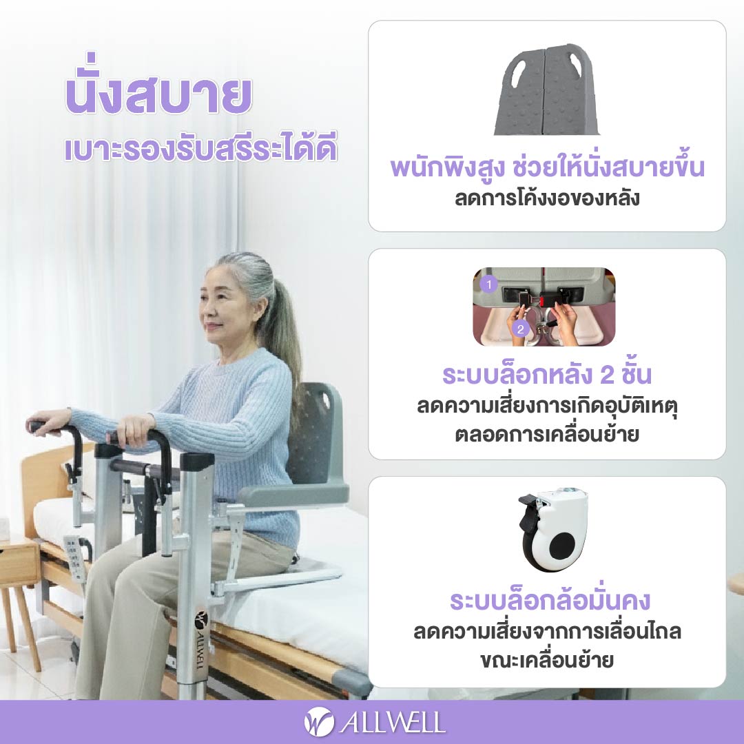 - รถเข็น 4 in 1 ใช้งานได้หลากหลาย เช่น รถเข็นเคลื่อนย้ายผู้ป่วย / เก้าอี้นั่งถ่าย /