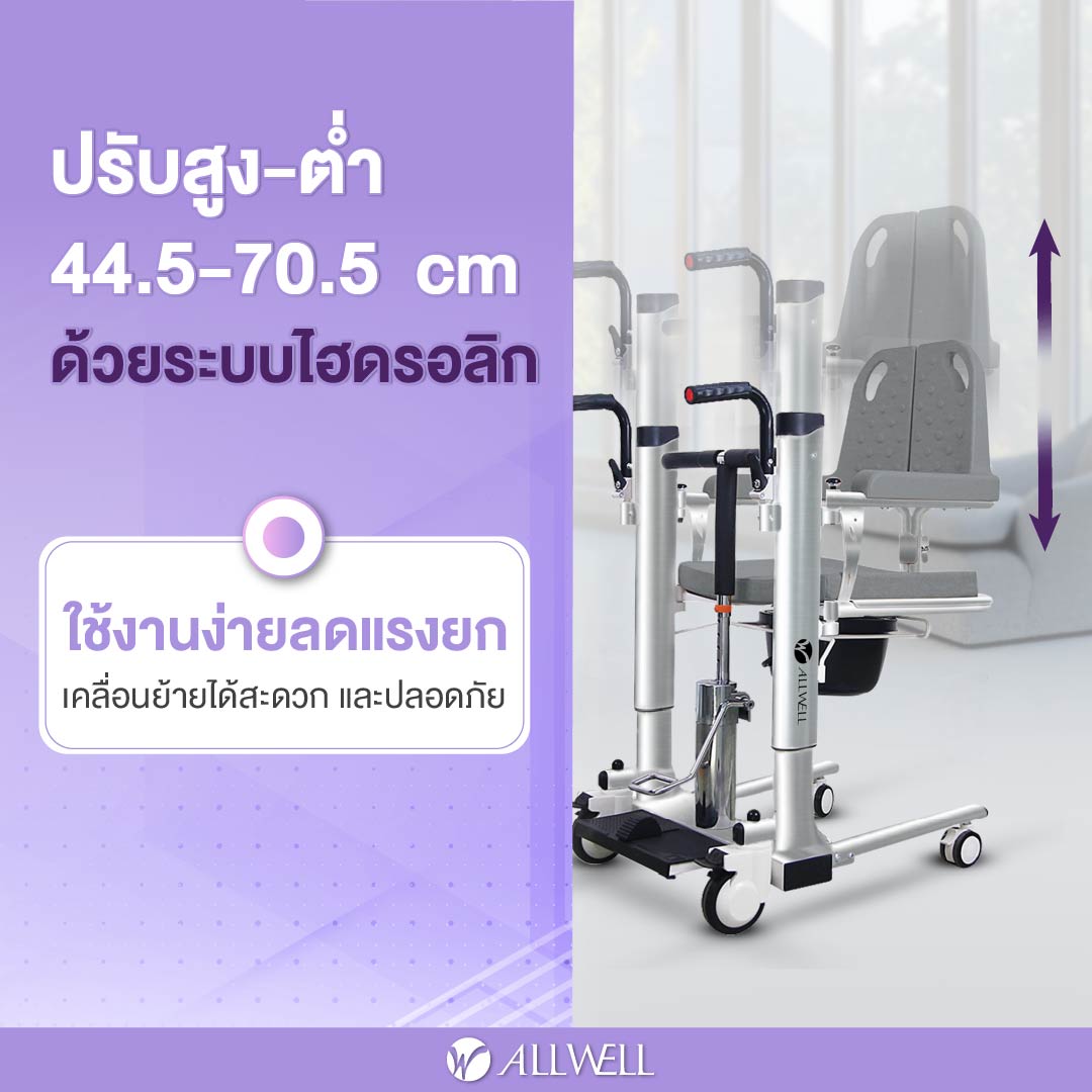 ช่วยลดแรงยก ลดภาระของผู้ดูแล ใช้งานง่าย ปรับสูง-ต่ำได้ 44.5–70.5 cm ด้วยระบบไฮดรอลิก - สามารถเคลื่อนย้ายผู้ป่วย โดยไม่ต้องอุ้ม
